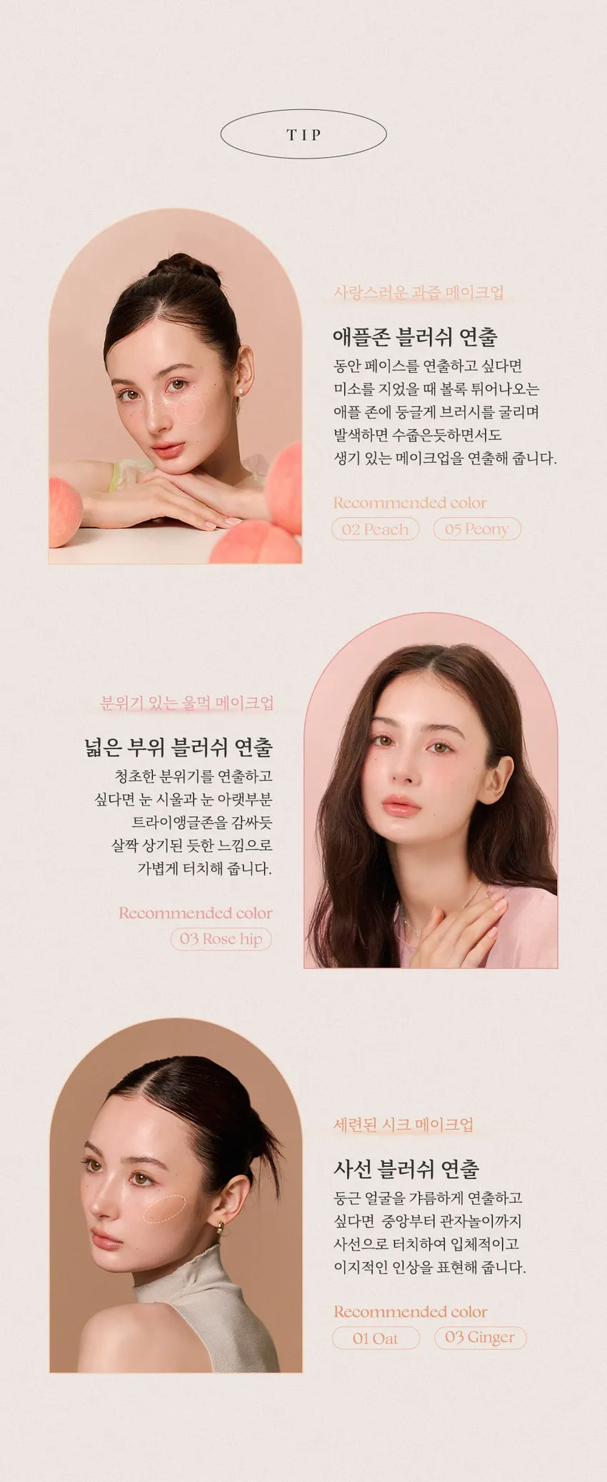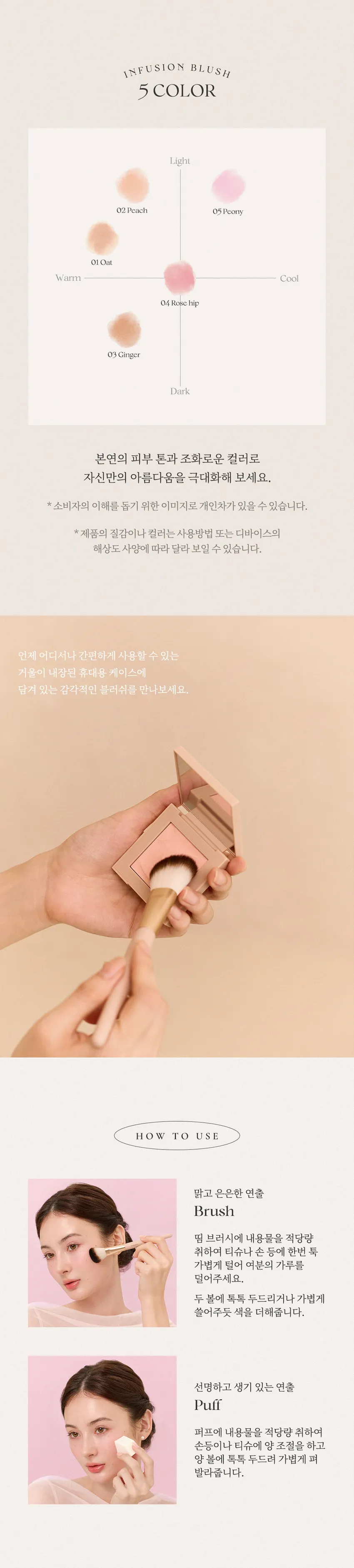 使用方式 / 使用刷具或粉撲,取適量腮紅,然後輕拍於雙頰或輕輕暈染即可。