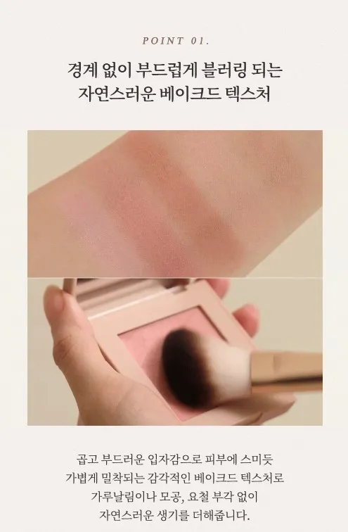 獨特的烘焙粉質,使腮紅能均勻服貼,乾燥肌膚也能完美持妝,油肌則展現自然暈染效果。