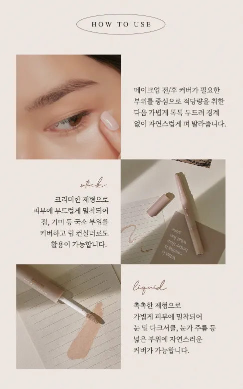 使用方式 / 底妝前/後,針對需要遮蓋的部位取適量遮瑕,輕點塗抹遮蓋。