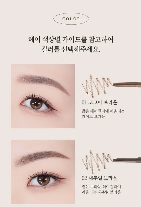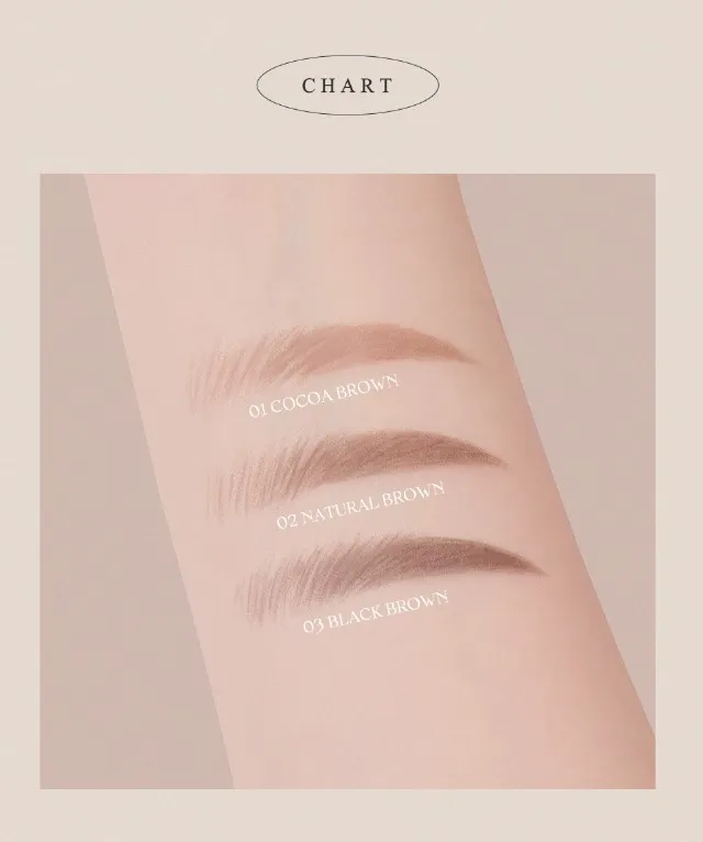 01 可可棕(Cocoa Brown)適合淺色髮色,自然輕盈妝感。