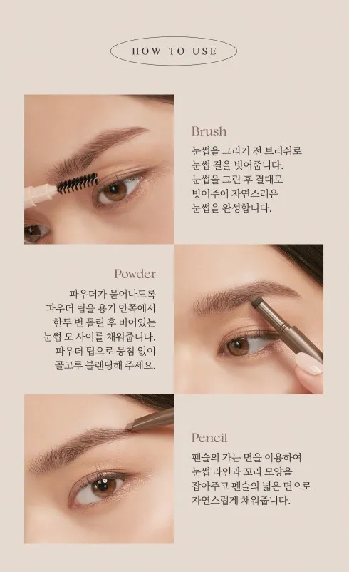 使用方式 / 使用刷頭,順著眉毛生長方向梳理調整眉型,粉末筆頭填補眉毛間隙,筆尖勾勒眉型,筆面填補眉色。