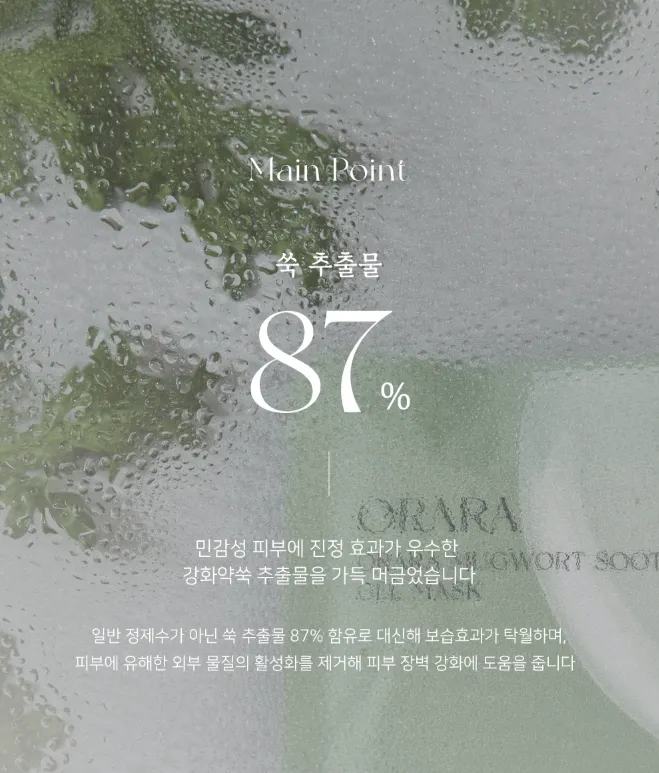 富含87%高濃度艾草萃取,溫和舒緩不適、同時深入補水,減緩環境刺激帶來的肌膚壓力。