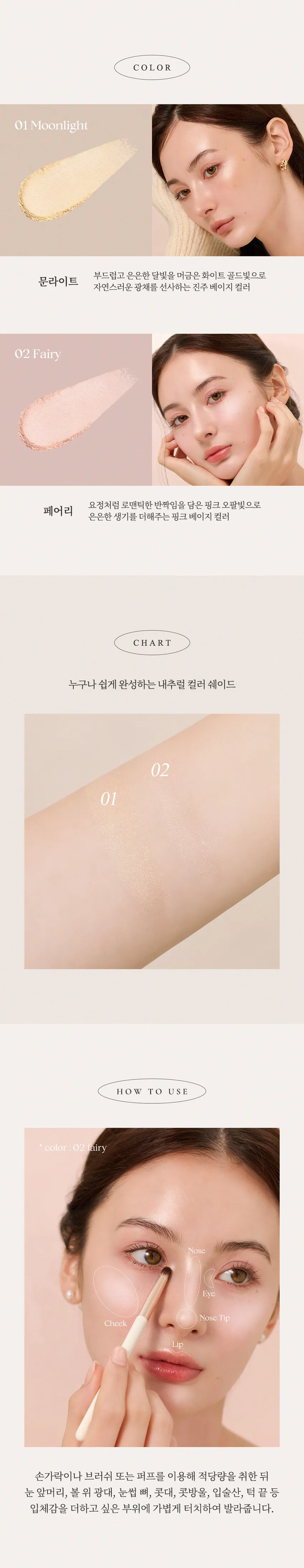 使用方式 / 用指尖或刷具取適量,輕點於眼頭、鼻樑、額頭、顴骨、唇峰等部位。