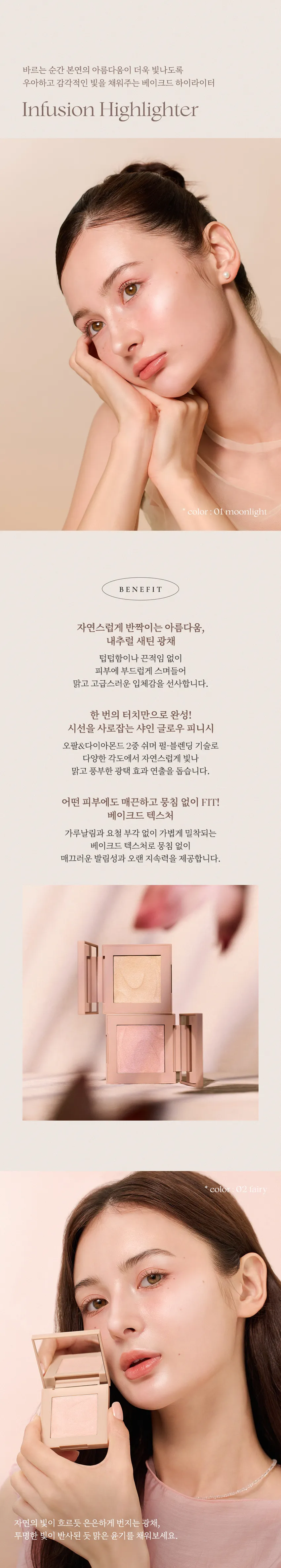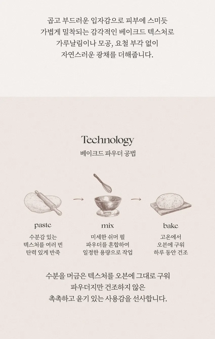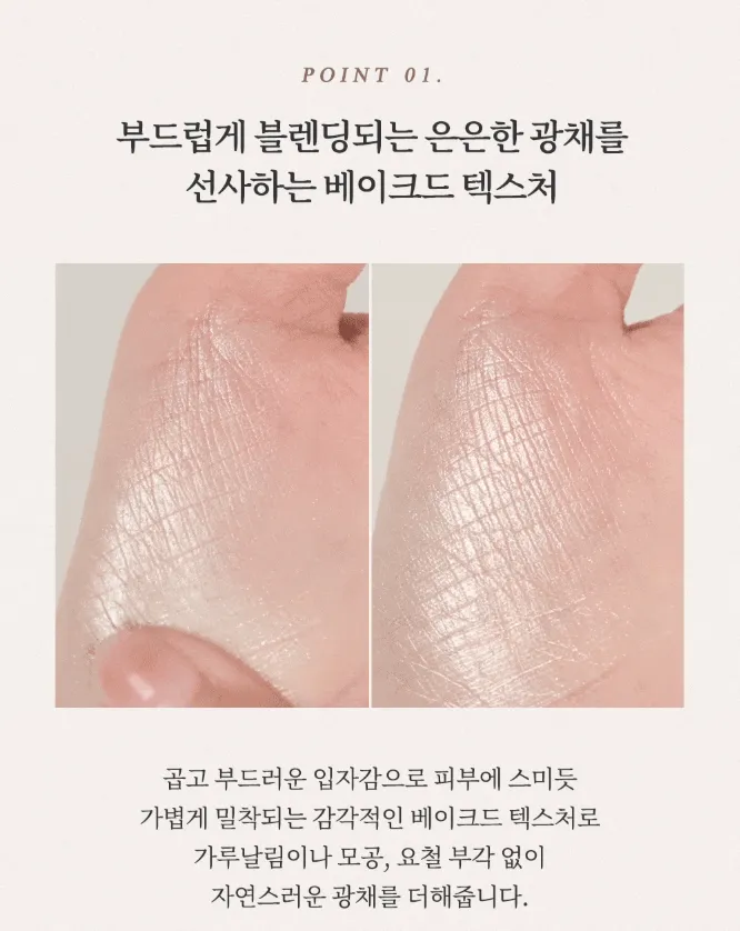 獨家烘焙工法與雙重閃亮粉體技術,細緻的珠光輕柔融入肌膚,